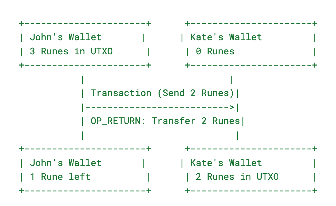 - When the transaction is processed, the Bitcoin network updates the UTXO to show that John now has 1 Rune and Kate has 2.